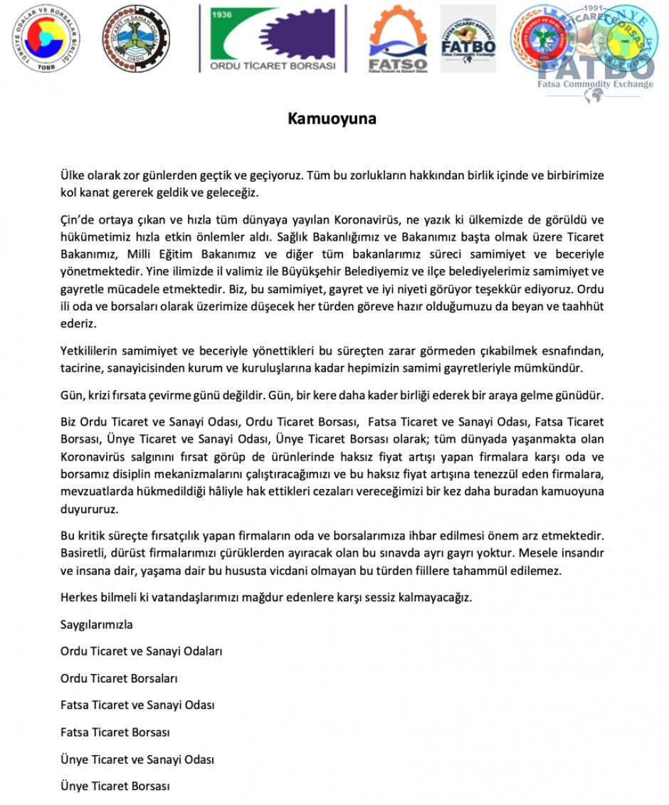 Biz Ordu, Fatsa , Ünye, Ticaret ve Sanayi Odaları ile Ticaret Borsaları olarak; tüm dünyada yaşanmakta olan Corona Virüs salgınını fırsat görüp de ürünlerinde haksız fiyat artışı yapan firmalara karşı oda ve borsamız disiplin mekanizmalarını çalıştıracağımızı ve bu haksız fiyat artışına tenezzül eden firmalara, mevzuatlarda hükmedildiği hâliyle hak ettikleri cezaları vereceğimizi bir kez daha buradan kamuoyuna duyururuz.